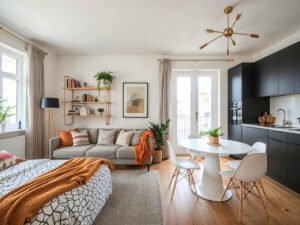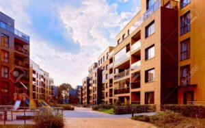 Apartment in residential building exterior. Housing structure at blue modern house of Europe. Rental home in city district on summer. Architecture for business property investment, Vilnius,